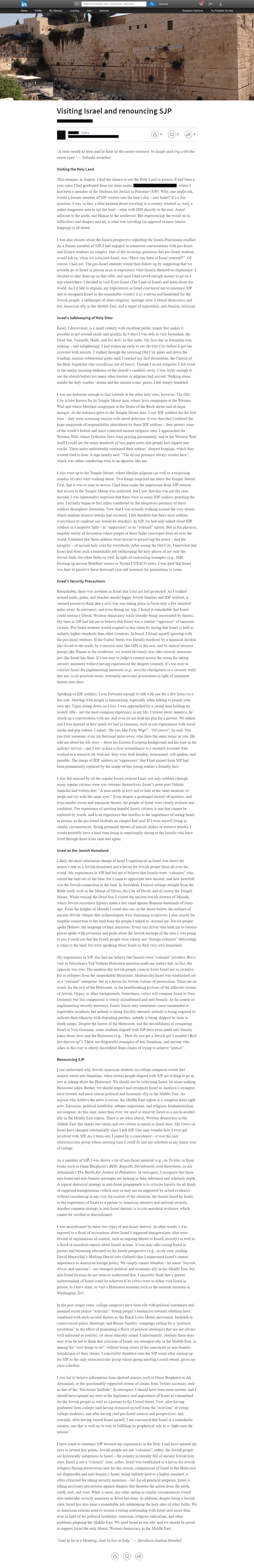 I have come to renounce SJP because my experiences in the Holy Land have opened my eyes to several key points. Jewish people are not “colonists”, rather, the Jewish people are historically indigenous to Israel... Israel [is] being unfairly held to a higher standard