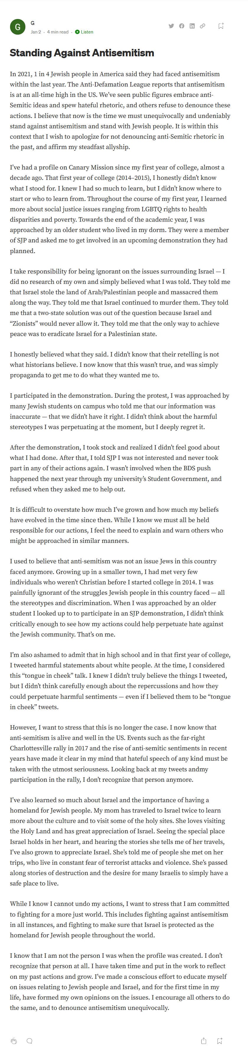 When I was approached by an older student I looked up to to participate in an SJP demonstration, I didn’t think critically enough to see how my actions could help perpetuate hate against the Jewish community. That’s on me.