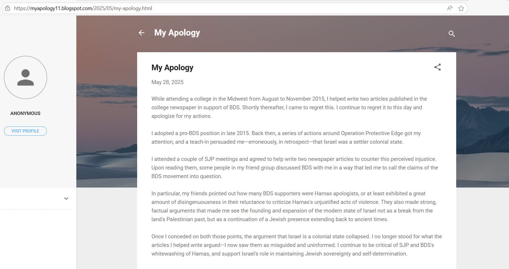 I continue to be critical of SJP and BDS's whitewashing of Hamas, and support Israel's role in maintaining Jewish sovereignty and self-determination.