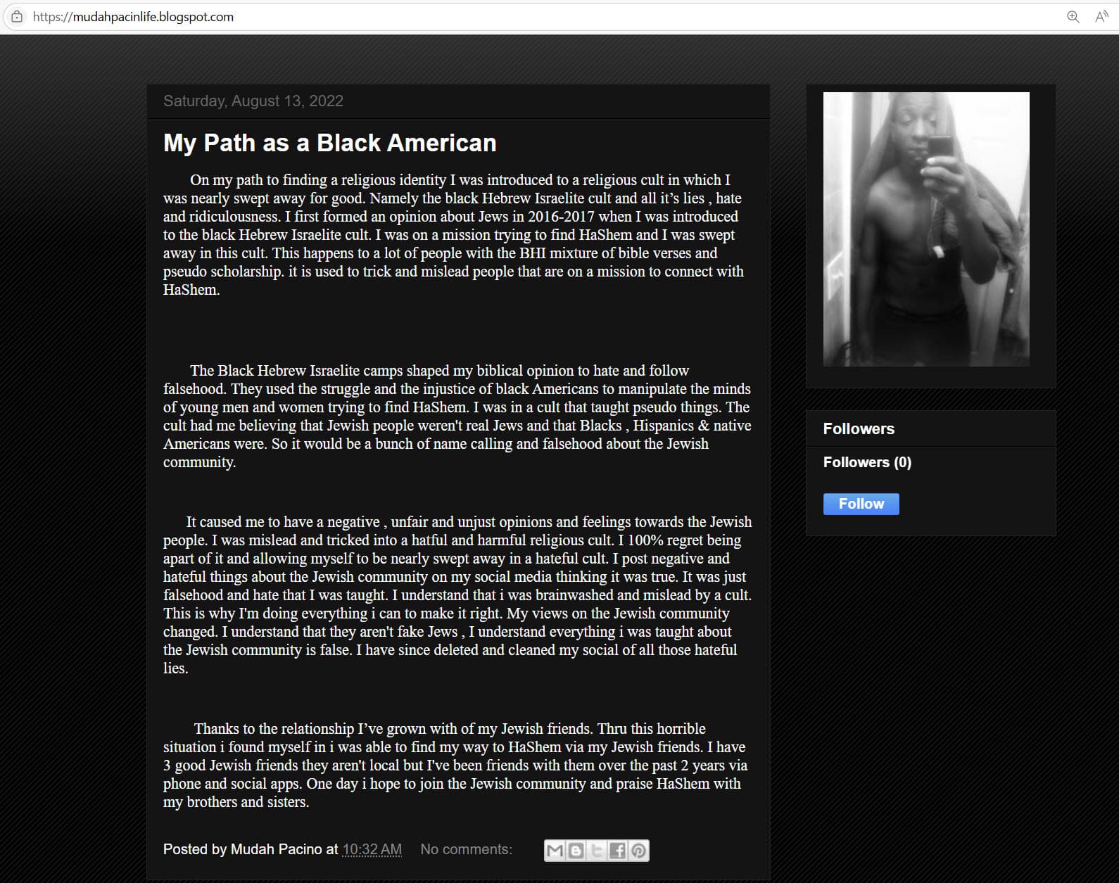 The Black Hebrew Israelite camps shaped my biblical opinion to hate and follow falsehood...It caused me to have a negative , unfair and unjust opinions and feelings towards the Jewish people.