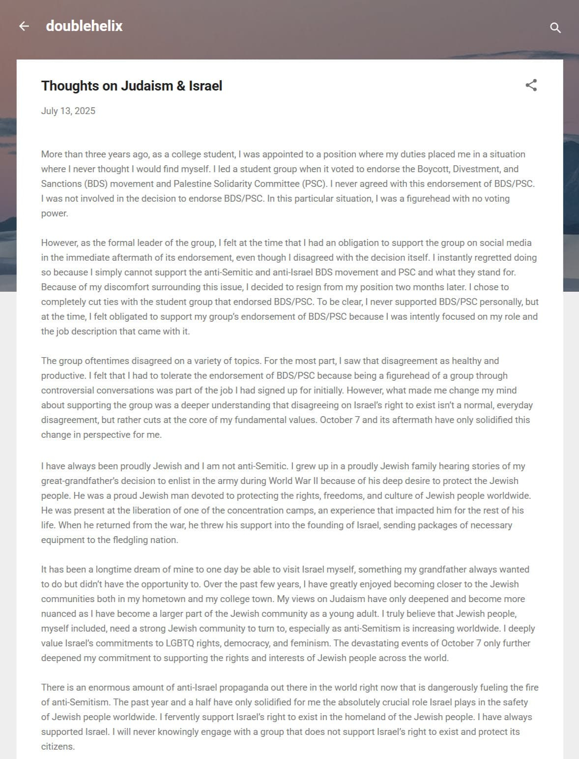 ...what made me change my mind about supporting the group was a deeper understanding that disagreeing on Israel’s right to exist isn’t a normal, everyday disagreement, but rather cuts at the core of my fundamental values.