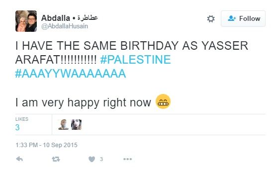 On September 10, 2015, Husain tweeted — "I HAVE THE SAME BIRTHDAY AS YASSER ARAFAT!!!!!!!!!!! #PALESTINE #AAAYYWAAAAAAA I am very happy right now!”