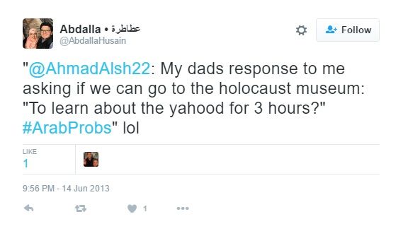 On June 14, 2013, Husain tweeted — "@AhmadAlsh22: My dads response to me asking if we can go to the holocaust museum: ‘To learn about the yahood [Jew] for 3 hours?’ #ArabProbs" lol."