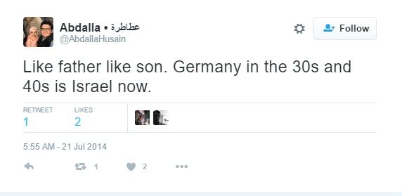 On July 21, 2014, Husain tweeted — "Like father like son. Germany in the 30s and 40s is Israel now."