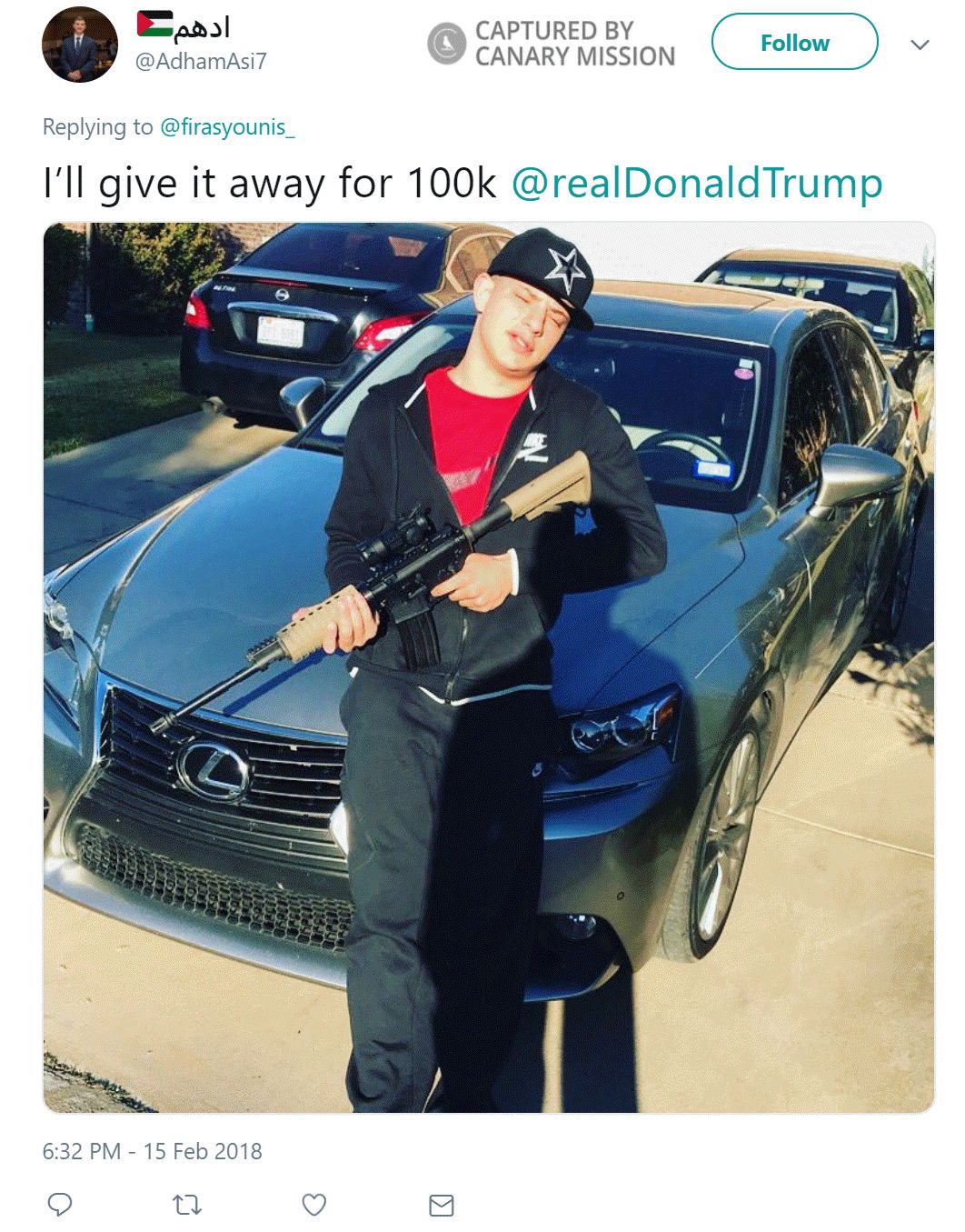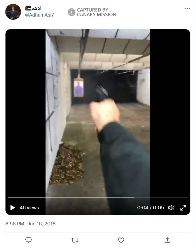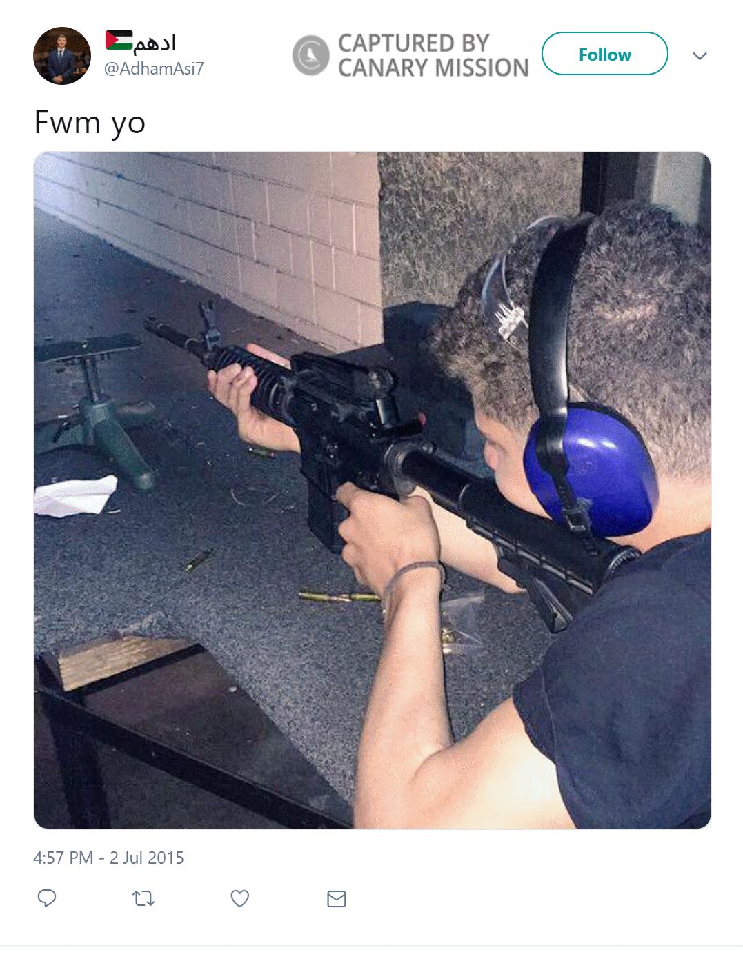 Adham Asi is a gun enthusiast, has expressed a desire to join the Hamas terror group and praised his terrorist cousin, Mohammed Assi, who was an operative of Palestinian Islamic Jihad (PIJ).Asi has also spread anti-Semitism, expressed support for violence and promoted hatred of Israel and Israelis.