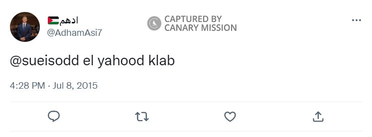 On July 8, 2015, Asi tweeted: “el yahood klab [the Jews are dogs].”