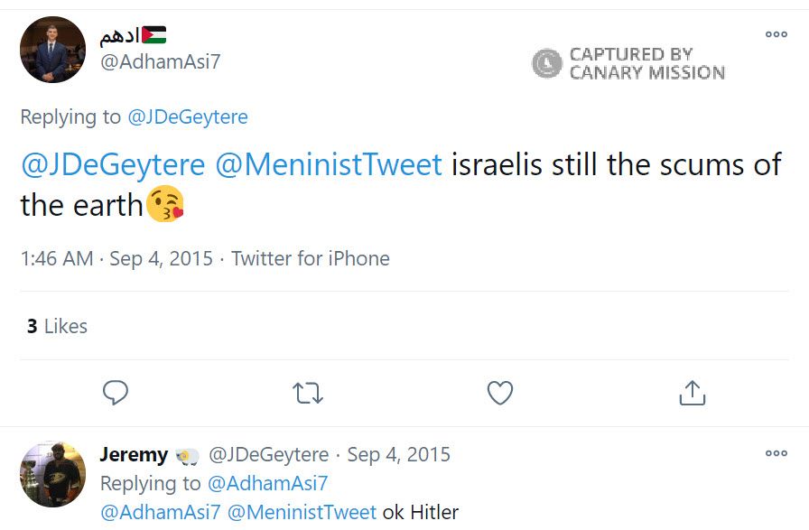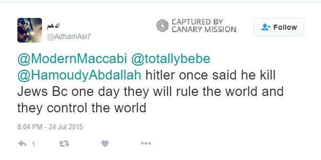 On June 13, 2015, Asi, referring to another Twitter user, tweeted: “@LoveIsraelProud @Fala7i_King Jewish pig.”On August 16, 2014, Asi tweeted: “I miss f**king with the yahood [Jews].”
