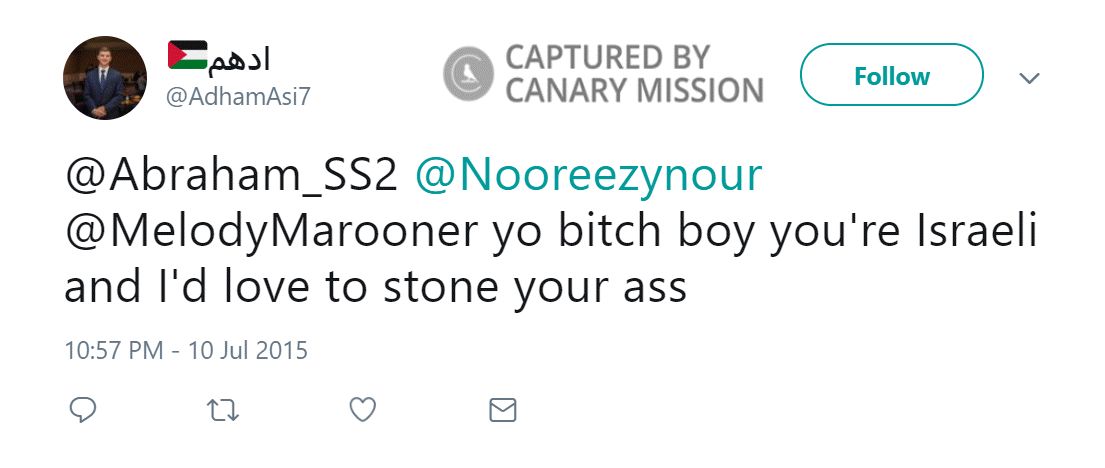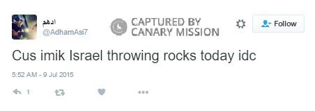 On July 10, 2015, Asi tweeted: “...yo b**ch boy you're Israeli and I'd love to stone your a**.”On July 9, 2015, Asi tweeted: “Cus imik [F**k] Israel throwing rocks today idc [I don’t care].”