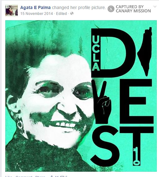 On November 8, 2013, Palma was featured in a Facebook photo, posted by SJP UCLA that said: “Our very own BDS Director Agatha Palma speaking during tonight's Divestment event! #PAWFall2013.”