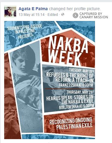 On May 13, 2014, Palma changed her Facebook profile picture to a poster promoting an SJP UCLA event called Nakba Week on Facebook.The poster promoted a May 19, 2014 event titled: “Refugees &The Right of Return: A Teach-In.”