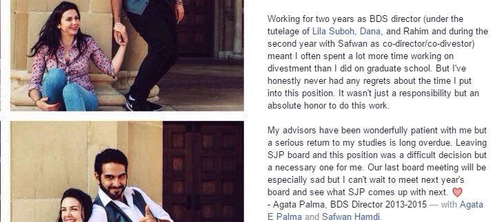 On July 22, 2014, Palma changed her Facebook profile picture to a poster promoting UC Divest, the campaign to pass the BDS resolution.