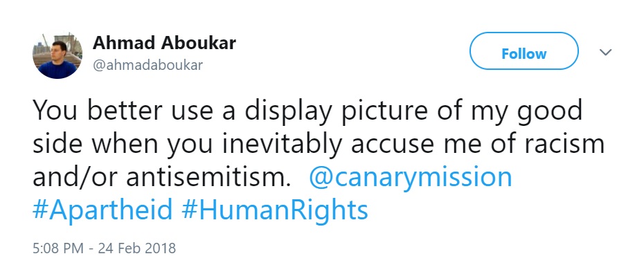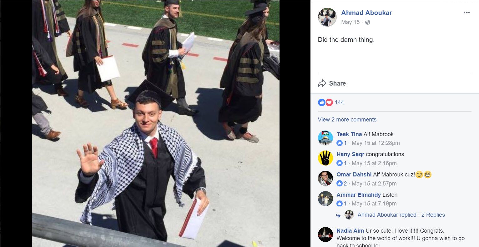 Ahmad Aboukar was the 2017-2018 treasurer of Students for Justice in Palestine (SJP) and an activist with the Muslim Students Association (MSA) at Ohio State University (OSU).Aboukar was also a member of the Facebook group “Muslim Students Association - THE Ohio State University [sic].”