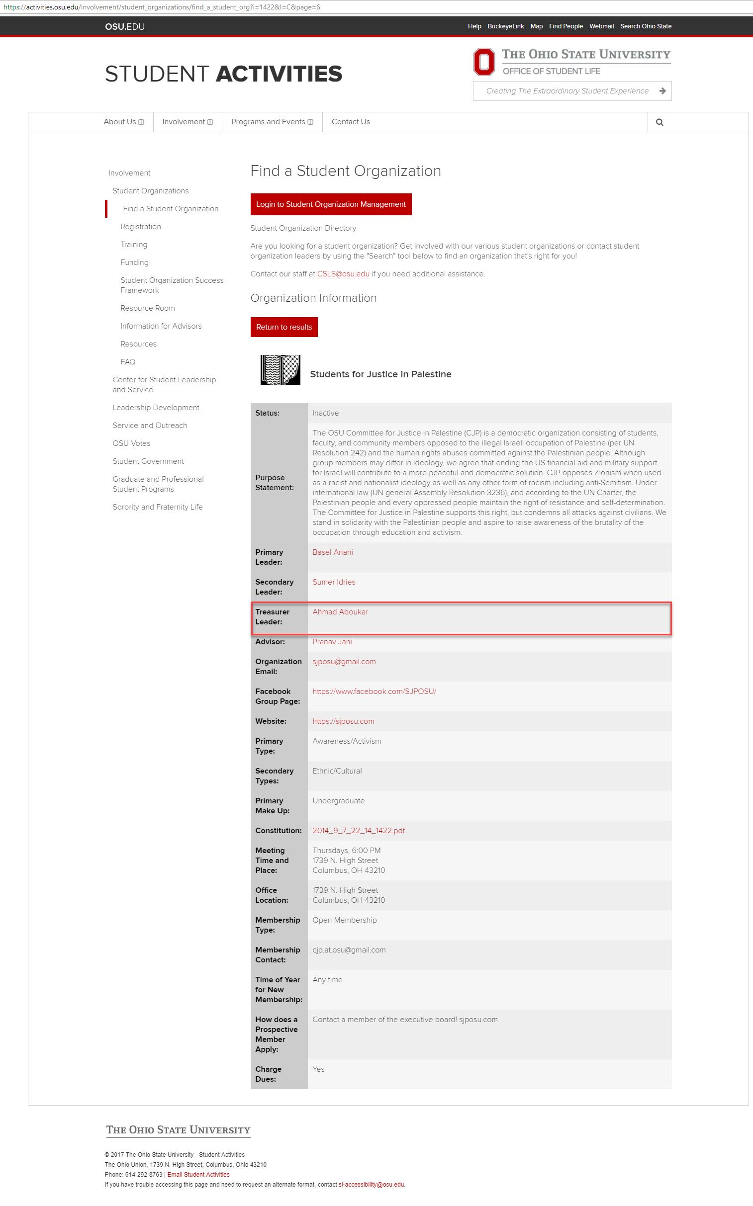 Students for Justice in Palestine at OSU (SJP OSU) was formerly known as the Committee for Justice in Palestine (CJP), until 2016.SJP OSU - Spreading Incitement 2013-2015