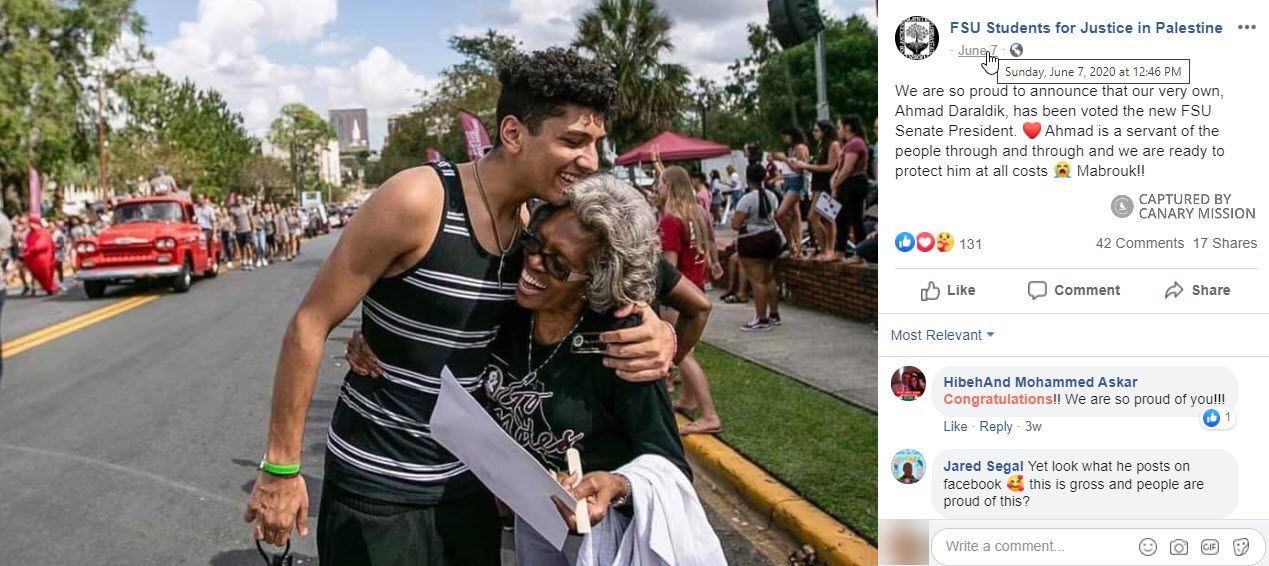 Ahmad Omar Daraldik [Ahmad Eldeek Daraldik] was the center of controversy following the exposure of his anti-Semitic social media posts after he became the Student Government Association (SGA) Senate President at Florida State University (FSU) in June 2020.Daraldik also created an anti-Semitic website, reportedly as a high school sophomore in 2016, in which he compared Israel to Nazi Germany and suggested that Israel engaged in forced medical experimentation on Palestinians. The website was maintained in the public domain through at least mid-June 2020.