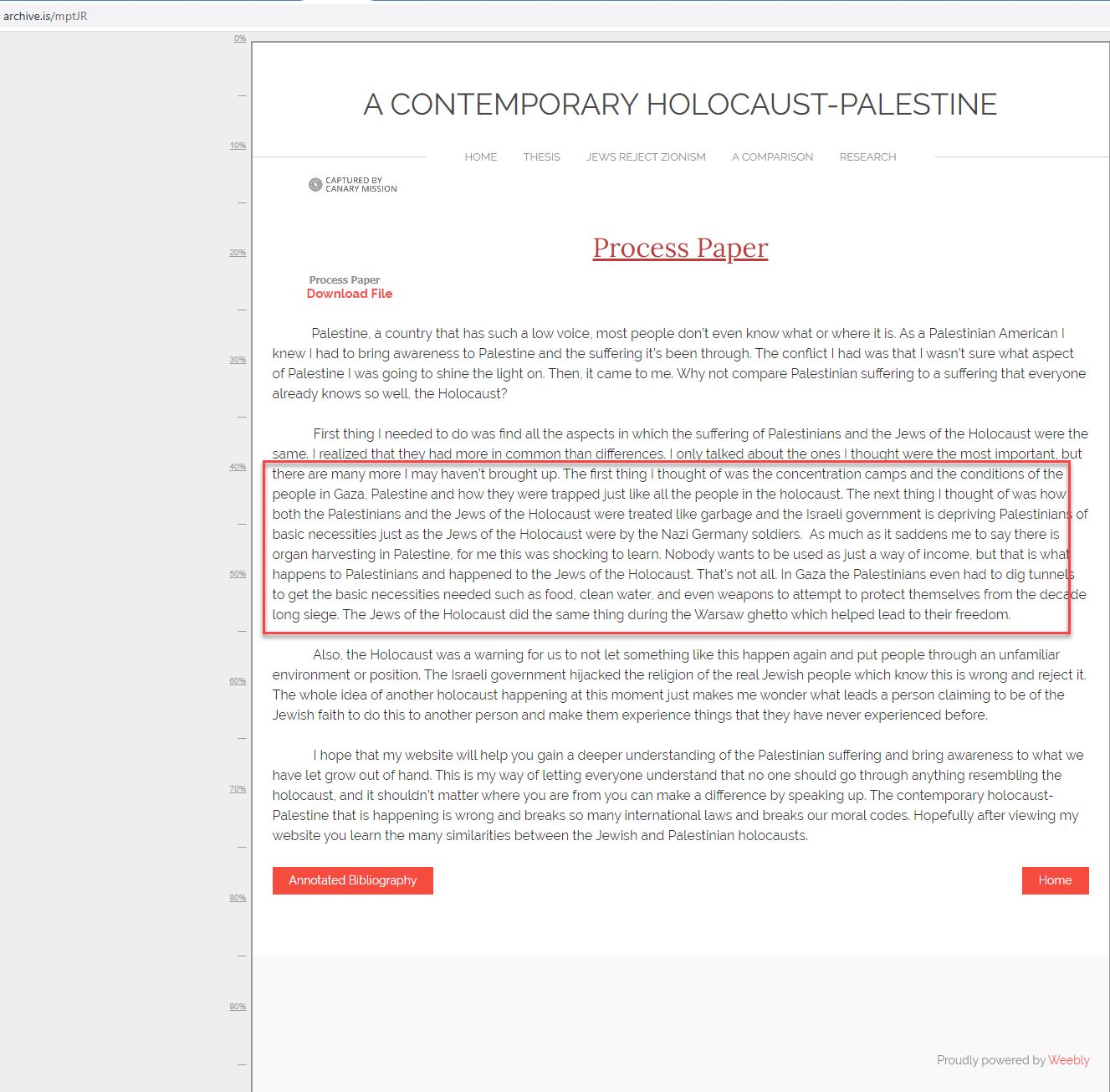 A 2016 “thesis,” titled: “A CONTEMPORARY HOLOCAUST-PALESTINE” and posted as a website by Daraldik was brought to wide attention in June 2020.The site’s homepage proclaimed: “The Holocaust never ended, it just moved to Palestine…” and went on to say “the Nazi German Holocaust… in no way justifies the contemporary Holocaust imposed upon the Palestinian people.”