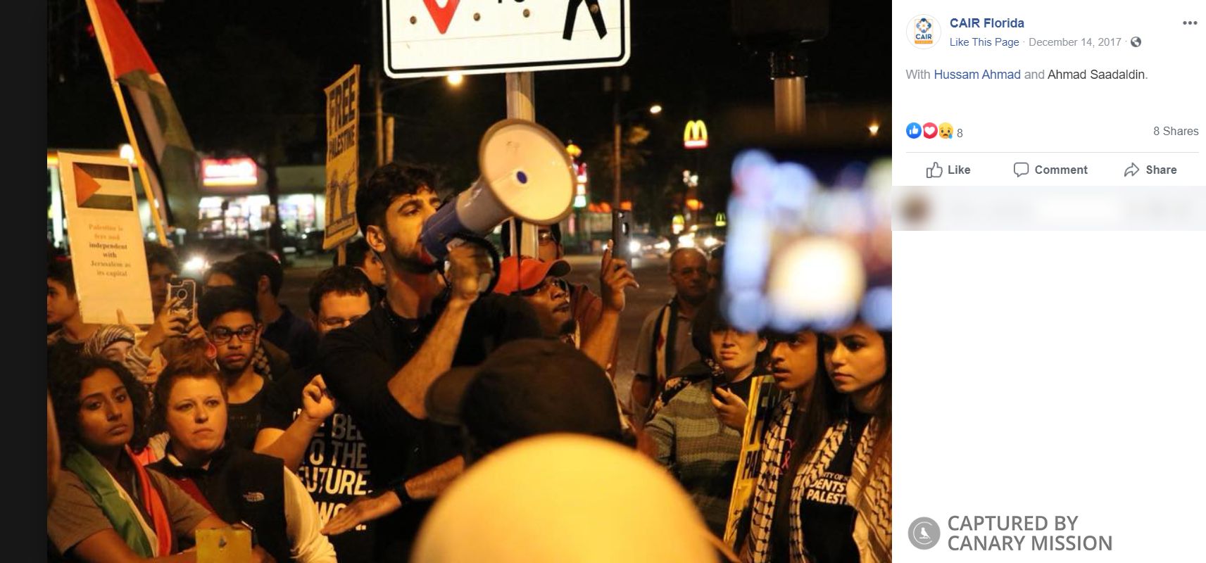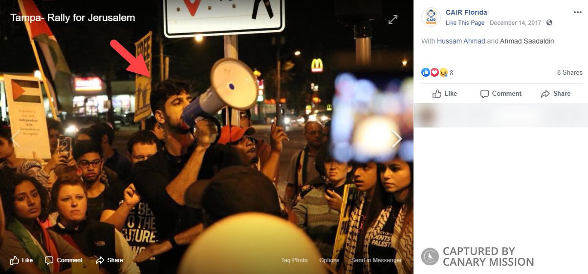 On May 27, 2016, Saadaldin shared an announcement of an event in Tampa, Florida, in support of Rasmea Odeh.