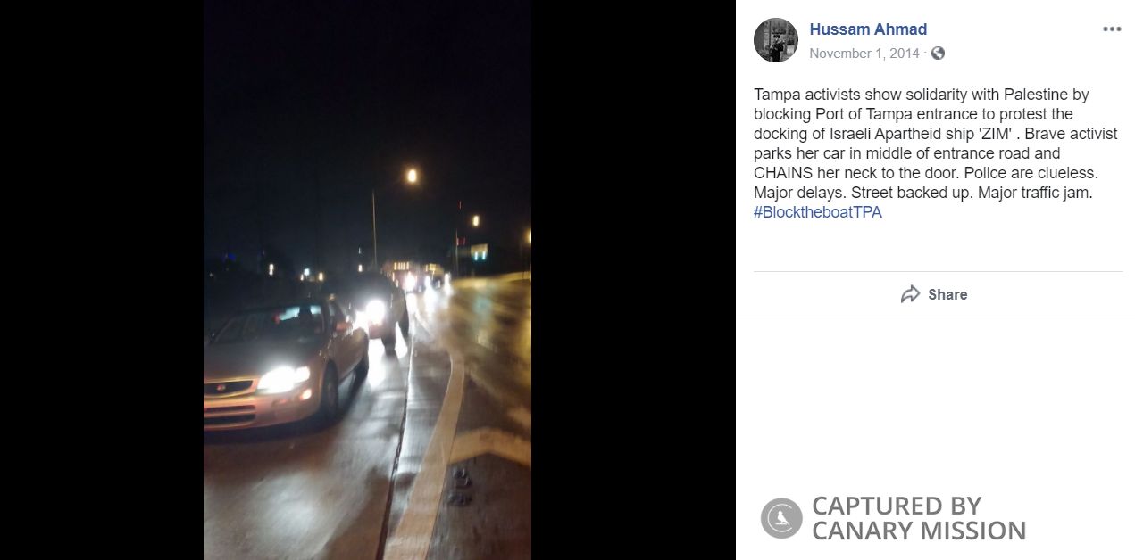 posted a photo of the “Block the Boat” protest to Facebook and added: “Tampa activists show solidarity with Palestine by blocking Port of Tampa entrance to protest the docking of Israeli Apartheid ship 'ZIM' . Brave activist parks her car in middle of entrance road and CHAINS her neck to the door. Police are clueless. Major delays. Street backed up. Major traffic jam. #BlocktheboatTPA.”