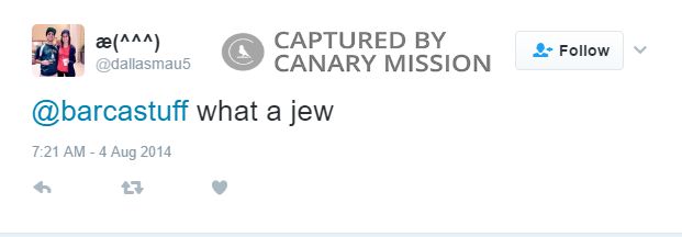 On July 26, 2014, Ismail Said Aboukar, an SJP and MSA UT Arlington activist, tweeted: “@CullenCody all the major corporations that run the US are owned by Jewish people. How do you not know this?”