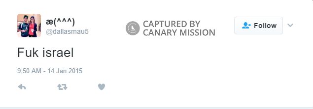 The Algemeiner also reported that an SJP UT Arlington “spokesman” said that one of their activists, Ahmad Hajmahmoud, whose anti-Semitic tweets were also exposed by Canary Mission, “had ‘dropped his membership and will no longer be continuing with us.’”