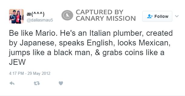 On May 29, 2012, Ellahi tweeted: “Be like Mario. He's an Italian plumber, created by Japanese, speaks English, looks Mexican, jumps like a black man, & grabs coins like a JEW.”