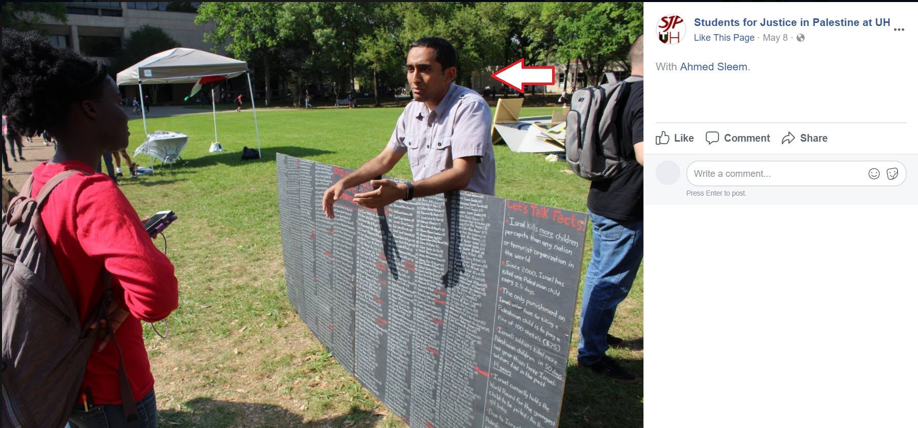 On May 8, 2017, Sleem participated in Israeli Apartheid Week (IAW), organized by SJP UH in 2017.Sleem held a sign that read: “Let’s Talk Facts. Israel kills more children per capita than any nation or terrorist organization in the world.”