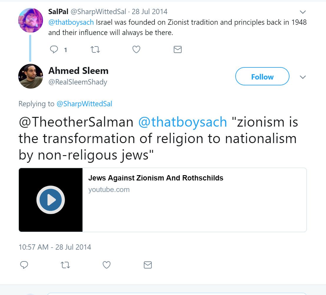 On July 28, 2014, Sleem tweeted: “@TheotherSalman @thatboysach ‘zionism is the transformation of religion to nationalism by non-religous jews’” The tweet linked to a video titled: “Jews Against Zionism And Rothschilds.”The video featured Nathanael Kapner, also known as Brother Nathanael, who opined on camera that “Jews dominate the media.”