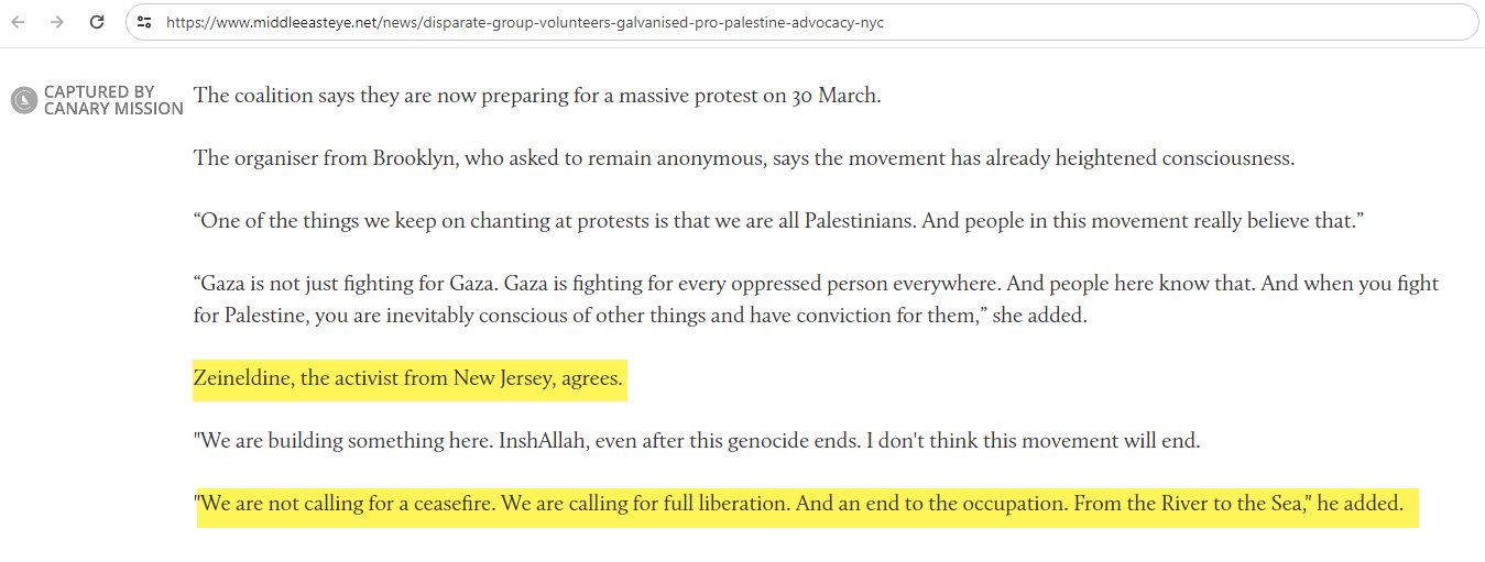 On March 13, 2024, the anti-Israel Middle East Eye (MEE) news website published an article in which Zeineldine reportedly said, regarding his activism with The People’s Forum: “We are not calling for a ceasefire. We are calling for full liberation. And an end to the occupation. From the River to the Sea.”“From the River to the Sea, Palestine will be Free” is a chant used [00:02:47] to call for the elimination of the State of Israel. It has also been employed by Hamas leader Khaled Mashal to call for the replacement of Israel with an Islamic state. In April 2024, the U.S. House of Representatives passed a resolution condemning the chant as antisemitic.