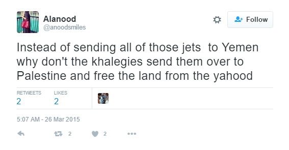 On March 26, 2015, Al-Wadei tweeted — "Instead of sending all of those jets to Yemen why don't the khalegies send them over to Palestine and free the land from the yahood [Jews]."