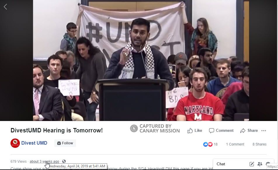 The clip was taken from a video shared on Facebook by the UMD SGA on November 17, 2017, where Masud was featured [01:57:17] speaking in support of a divestment bill at an SGA meeting.