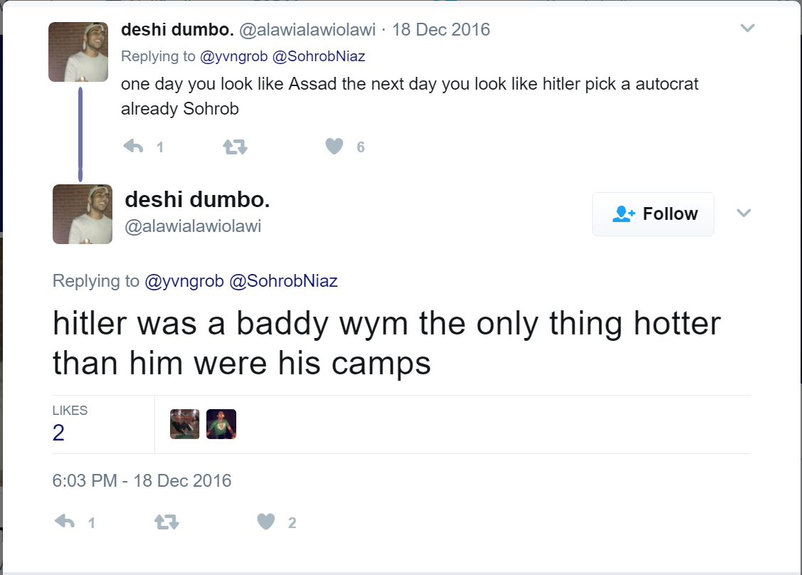 On December 18, 2016, while joking about his friend’s resemblance to Adolf Hitler, Masud tweeted: “hitler was a baddy [a bad man] wym [what do you mean?] the only thing hotter than him were his camps.”Supporting a Terrorist