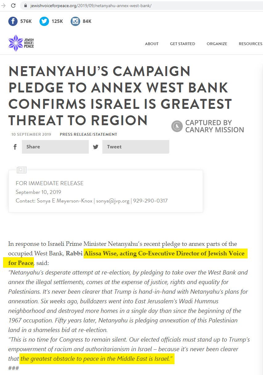 On September 10, 2019, Wise said in a JVP statement that “...the greatest obstacle to peace in the Middle East is Israel.”