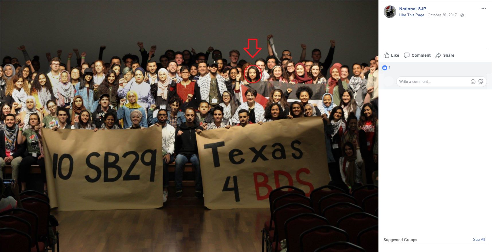 Amal Algharably [Em Algharably] has spread hatred of Israel as an activist with Students for Justice in Palestine (SJP) at Eastern Michigan University (EMU SJP).NSJP 2017 was held October 27-29, 2017 at the University of Houston (UH). The conference was themed “A Reimagined World: Dismantling Walls from Palestine to the Rio Grande.” Per the 2017 National SJP Conference website, the conference aimed to strengthen “collaborative efforts within all regions to pass BDS” and envision “pathways to achieving sanctions in the future.”