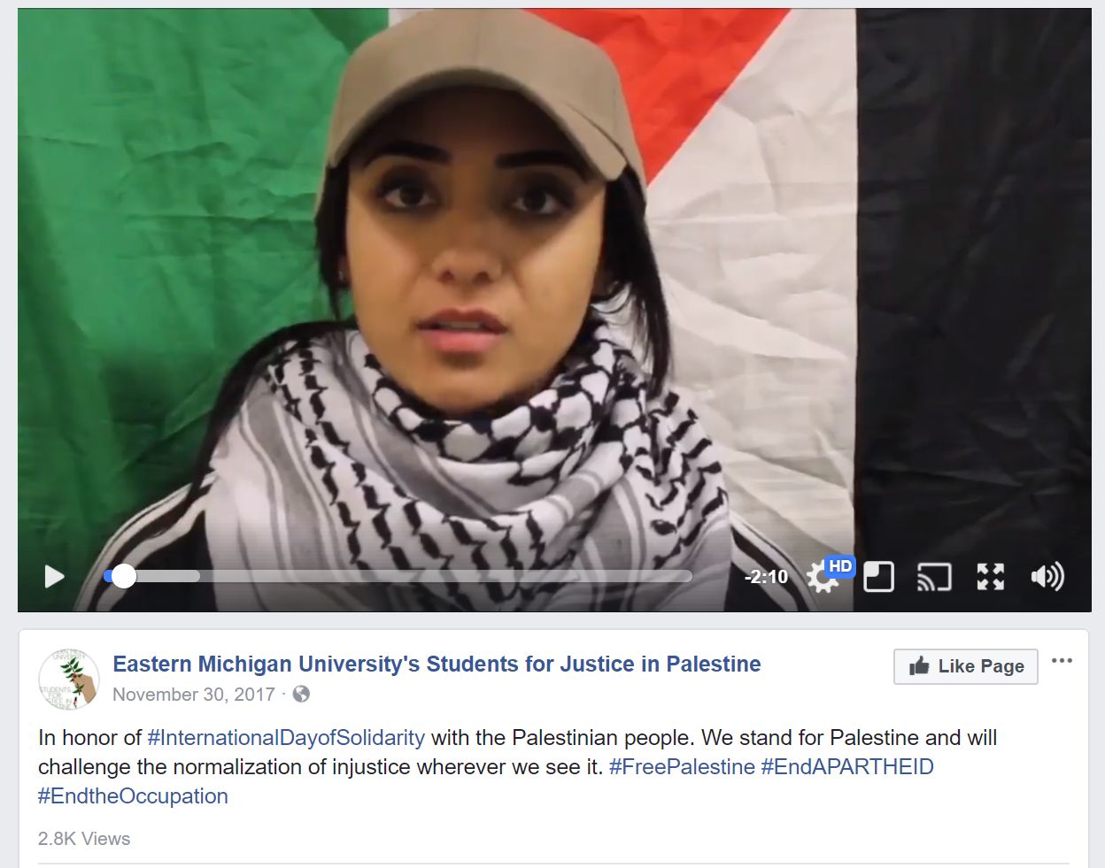 On November 30, 2017, Algharably appeared [00:00:04] in an EMU SJP video, where she alleged [00:00:35]: “Israel has been a perpetrator of war crimes, land grabbing … and has created the largest refugee population in the world.”