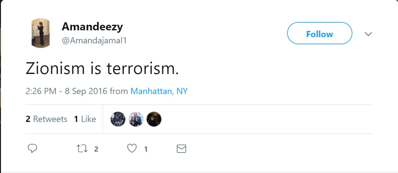 On September 8, 2016, Jamal tweeted: “Zionism is Terrorism.”