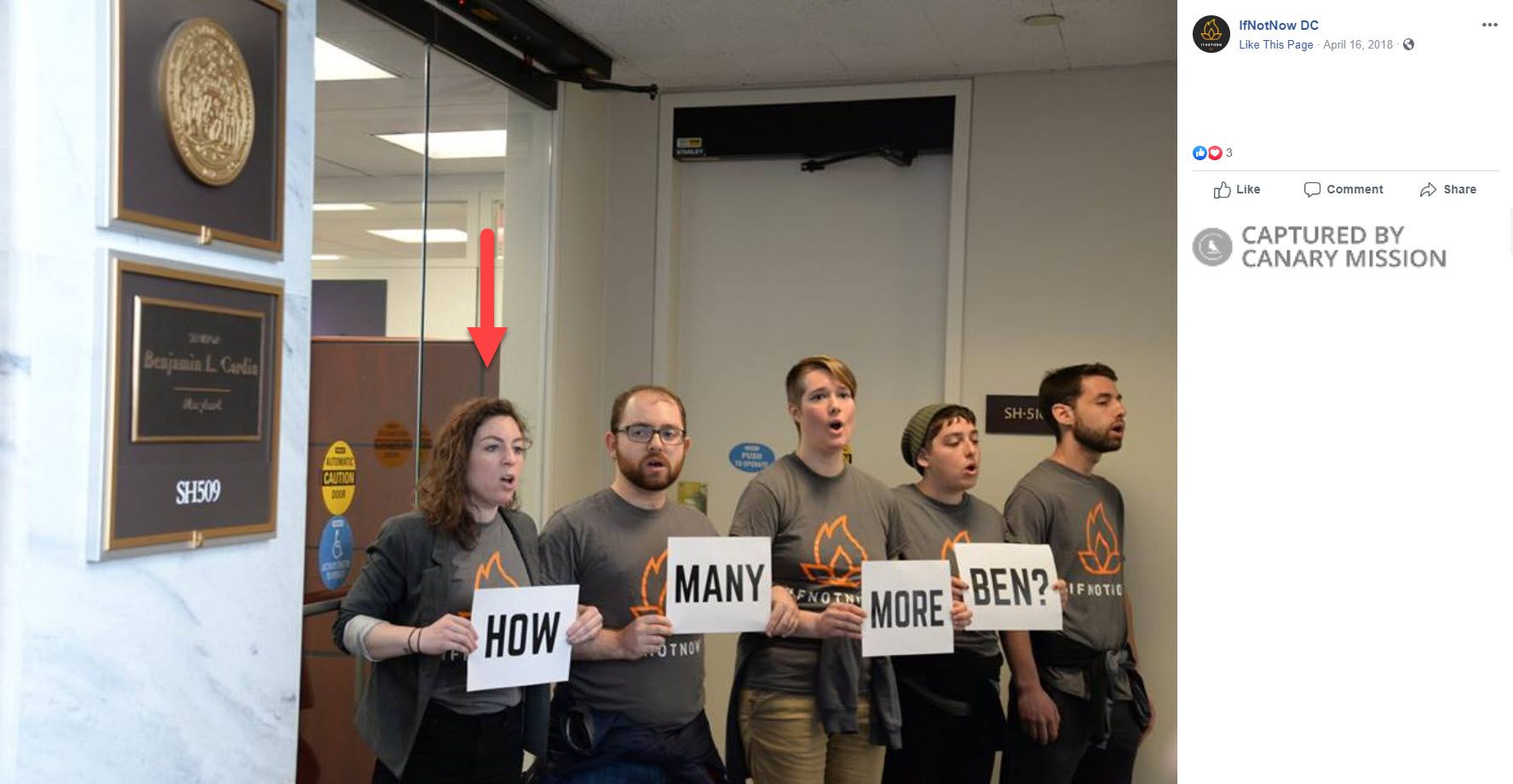 On April 16, 2018, Gaines helped lead [00:13:10] an INN DC disruption in partnership with Taher Herzallah, the Associate Director of Outreach & Grassroots Organizing of AMP. The disruption was to protest U.S. Senator Ben Cardin’s proposed anti-BDS legislation. INN activists were arrested for occupying Cardin’s office.