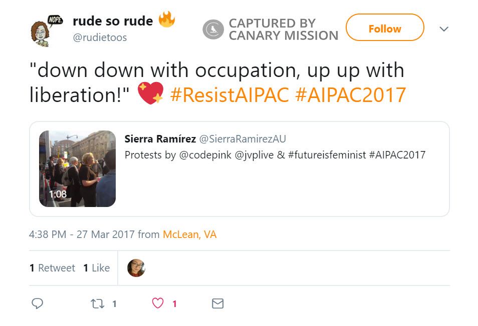 Gaines retweeted a tweet from that same daythat said: “Young Jews blocking the entrance to #AIPAC2017 to stand up for freedom and dignity for all Israelis and Palestinians! #JewishResistance.”