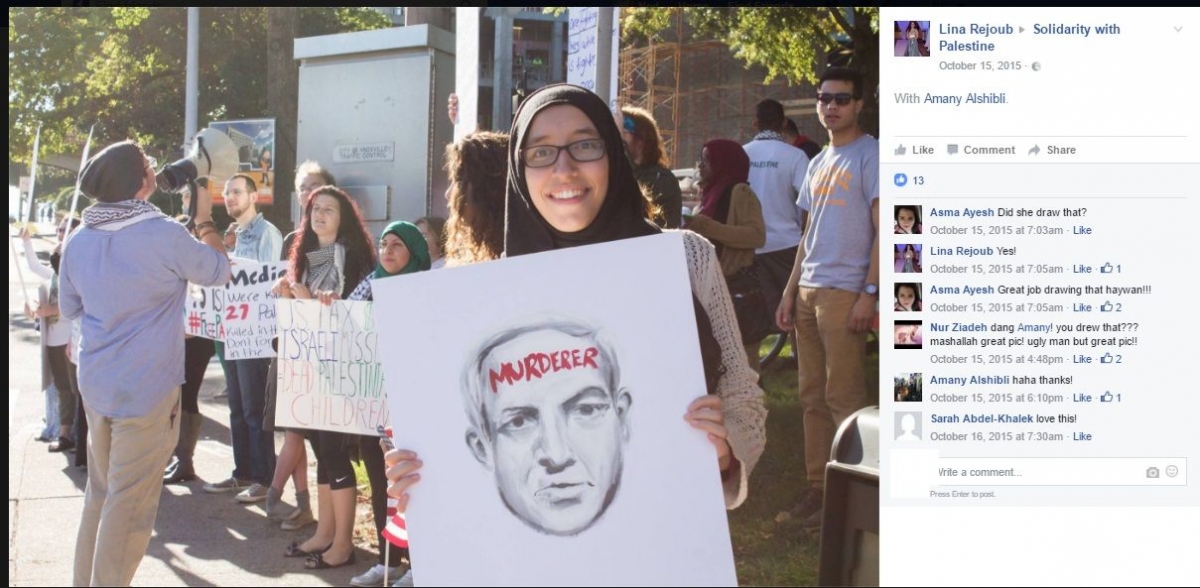 At the rally, Alshibi held a portrait she drew of Israel’s Prime Minister Benjamin Netanyahu’s face — with "Murderer" written in red across his forehead.