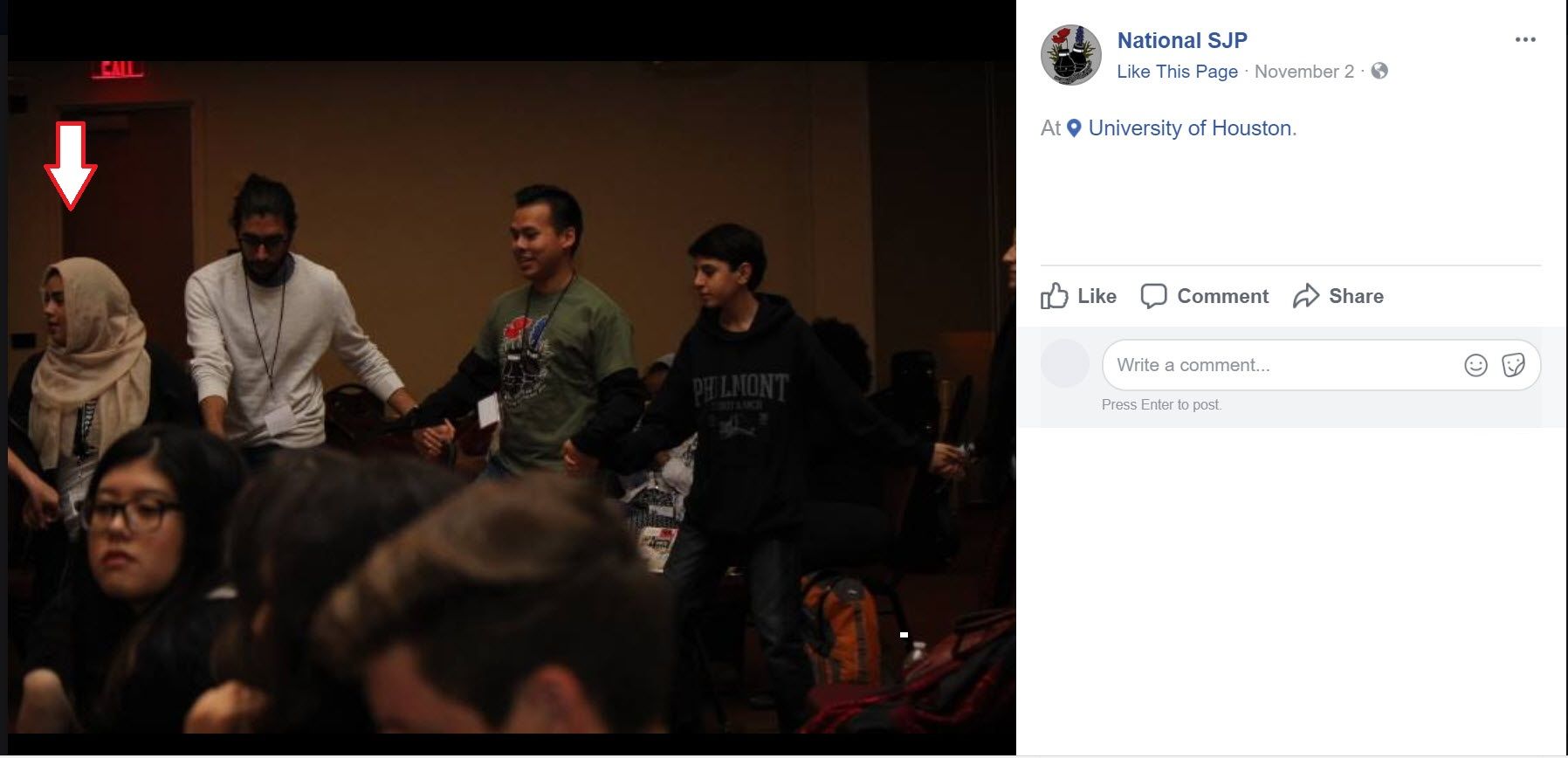 Ameera Abusnaneh is an affiliate of Students for Justice in Palestine (SJP) and attended the 2017 National SJP Conference.NSJP 2017 was held October 27-29, 2017 at the University of Houston (UH). The conference was themed “A Reimagined World: Dismantling Walls from Palestine to the Rio Grande.” Per the 2017 National SJP Conference website, the conference aimed to strengthen “collaborative efforts within all regions to pass BDS” and envision “pathways to achieving sanctions in the future.”
