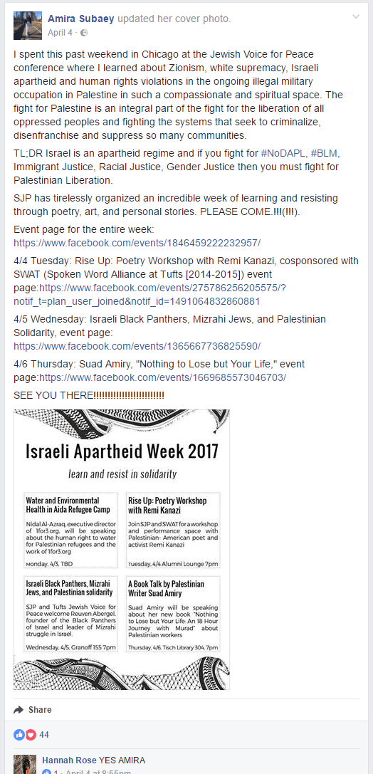 Subaey also promoted Tufts SJP’s “Israeli Apartheid Week 2017” (IAW 2017) in the photo. Among the events was a performance by anti-Israel poet Remi Kanazi, who is known for his aggressive anti-Israel performances. Tufts SJP hosted IAW 2017 from April 3 - 7, all less than a week before the Passover Eve BDS resolution vote.