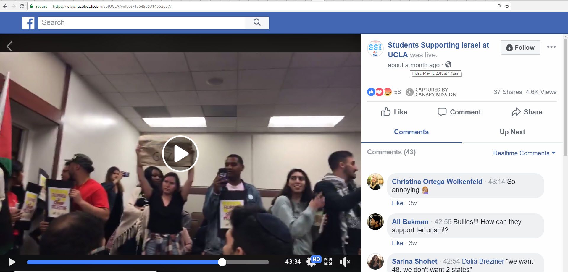 On May 17, 2018, Yacoub [00:42:26], along with SJP UCLA activists and affiliates, disrupted [00:00:47] an event hosted by Students Supporting Israel (SSI) on the UCLA campus. The event, titled "Indigenous People Unite," provided a forum for Jewish, Kurdish, and Armenian indigenous communities “to share the stories of their people.”Approximately 41 minutes into the lecture, SJP at UCLA members and Antifa activists invaded [00:41:16] the forum. Protester Armen Adamian walked toward the speakers and tore the Armenian flag off the wall. Adamian then threw [00:41:24] the Armenian panelist’s notes off the speakers’ table and leaned over him.