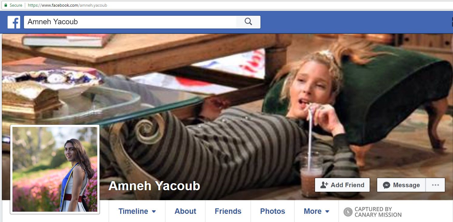 Amneh Yacoub participated in the violent disruption of a pro-Israel event at the University of California, Los Angeles (UCLA), alongside activists from Students for Justice in Palestine (SJP) at UCLA.As of October 2018, Yacoub’s LinkedIn page said she was a Research Assistant at the UCLA Semel Institute for Neuroscience and Human Behavior since August 2018, and an Emergency Department Scribe at ScribeAmerica since December 2015.