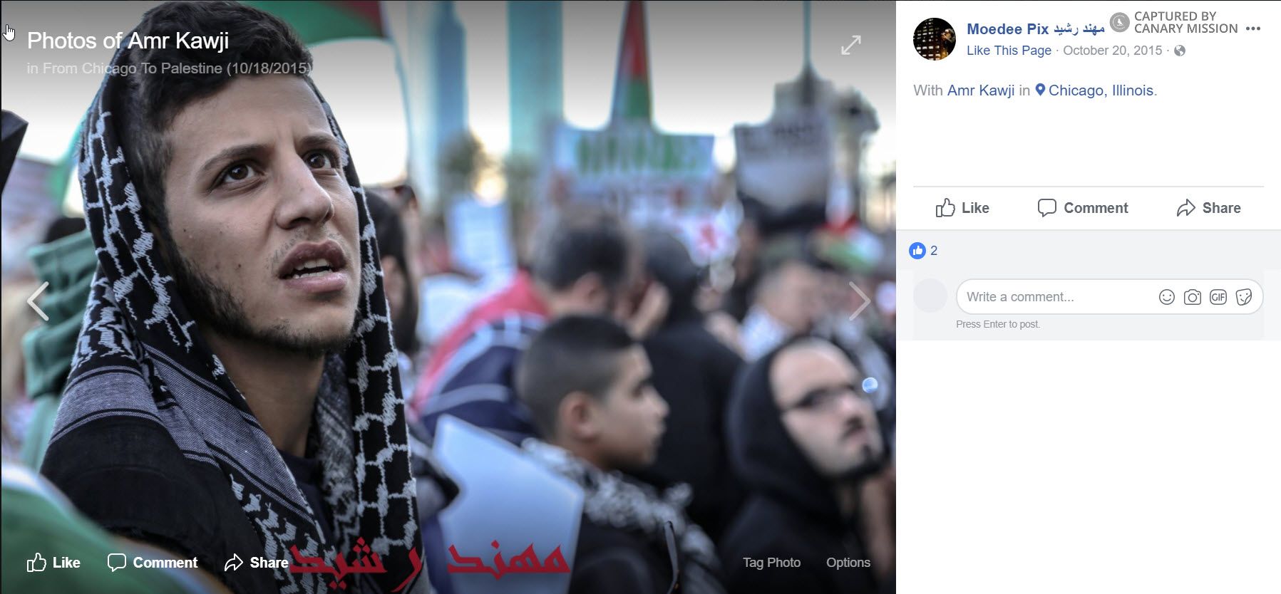 On October 18, 2015, during the “Knife Intifada,” Kawji attended an an AMP-organized demonstration in Chicago. Ahmed Hamad, an SJP activist in Chicago, led [00:00:11] hundreds of people in chants of “Intifada! Intifada! Intifada! Intifada! We Support the intifada!”On October 19, 2015, Kawji tweeted about the rally, writing: “Checkout photos taken from Chicago's #HandsOffAlAqsa protest.”