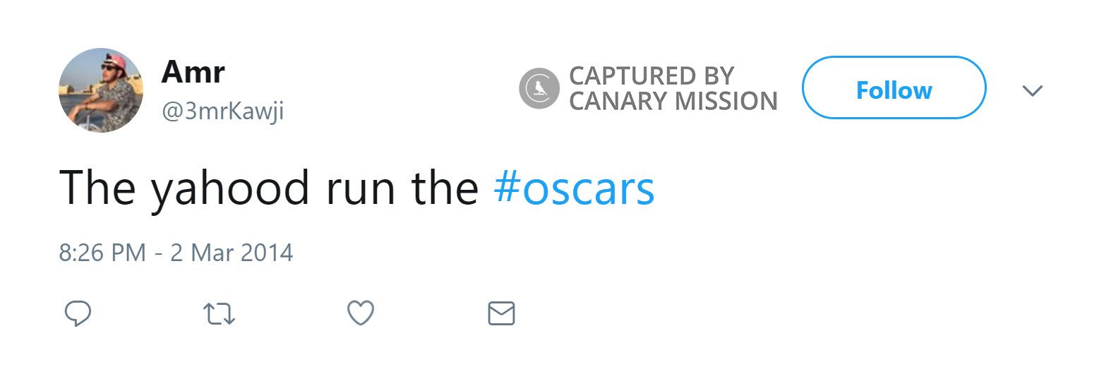 On March 2, 2014, Kawji tweeted: “The yahood [Jews] run the #oscars.”