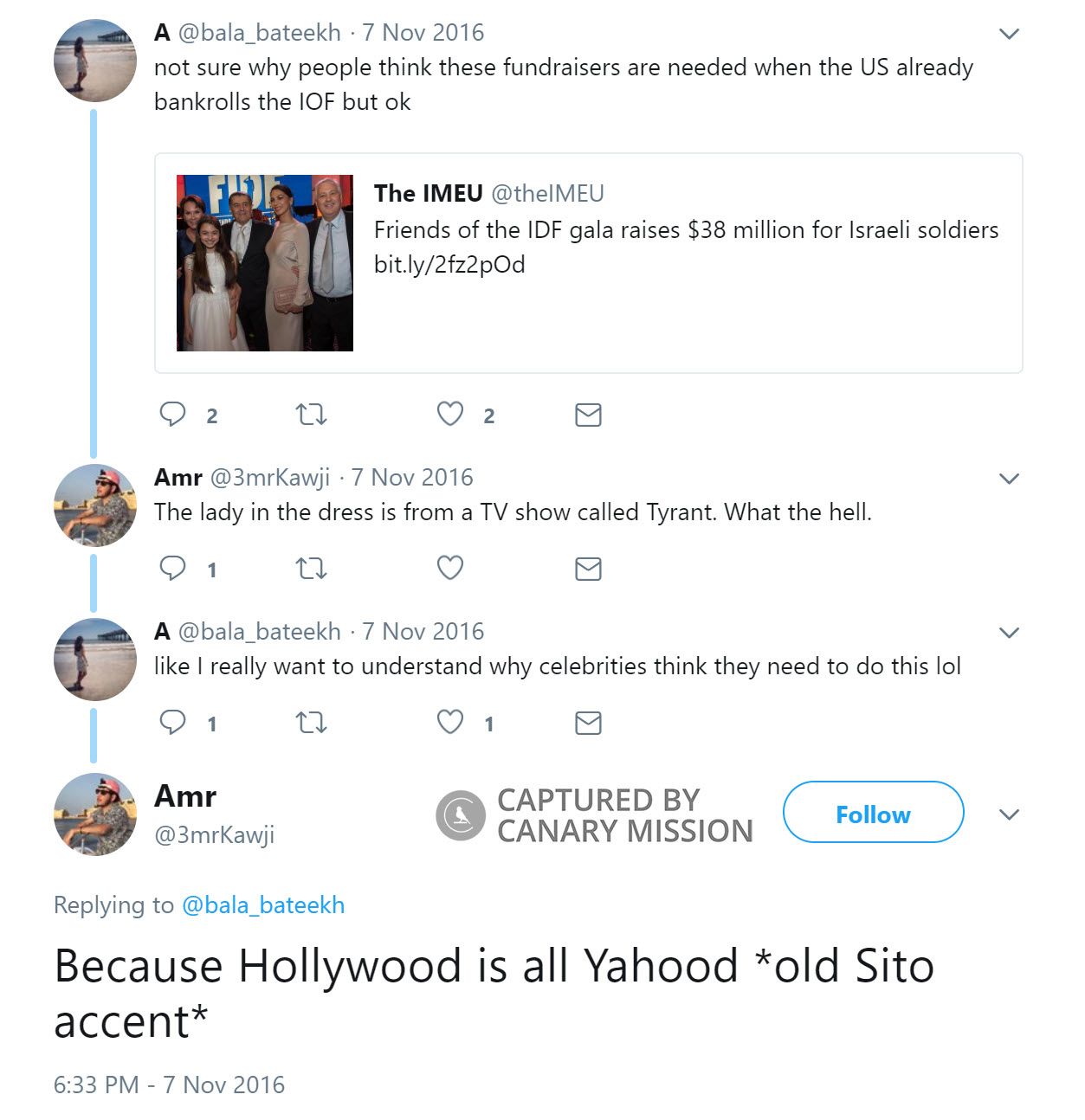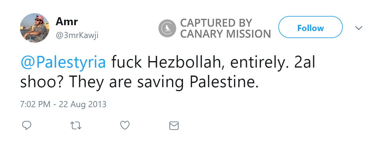 On August 22, 2013, Kawji tweeted: “@Palestyria f**k Hezbollah, entirely. 2al shoo? [Say what?] They are saving Palestine.”Supporting Terrorists