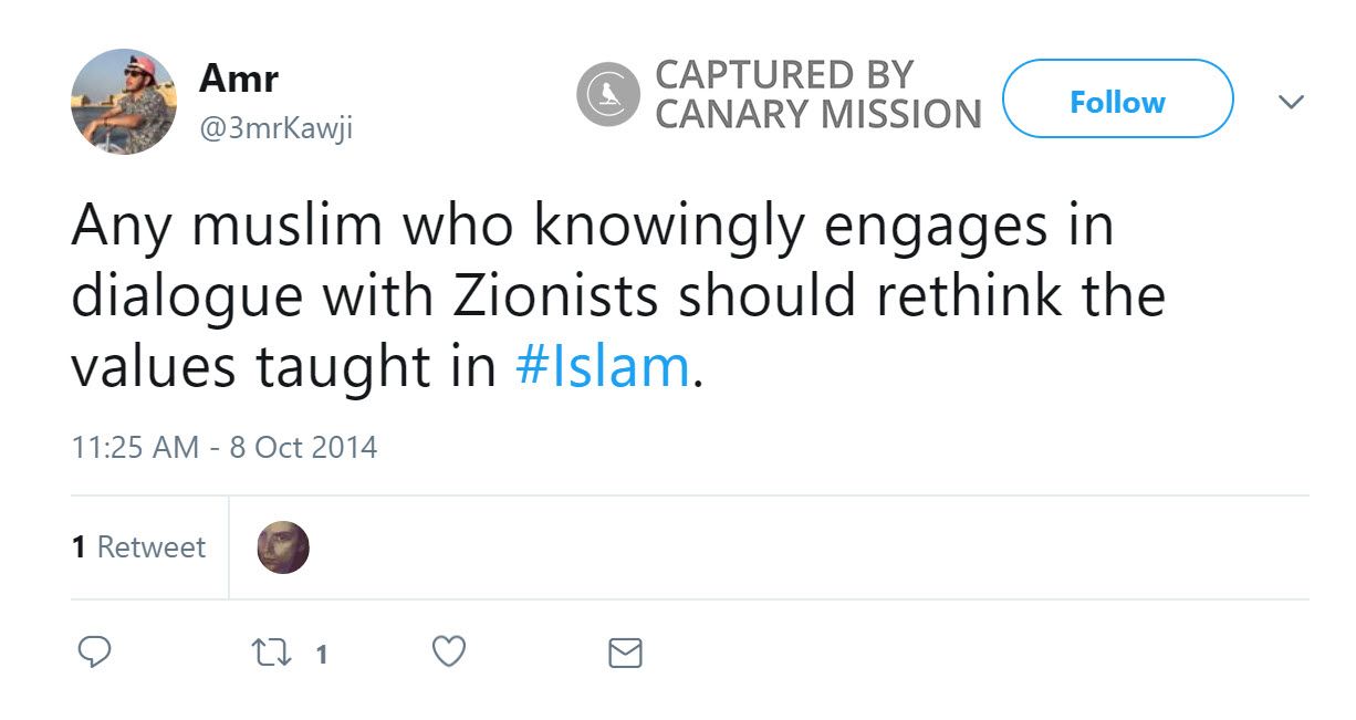 On October 8, 2014, Kawji tweeted: “Any muslim who knowingly engages in dialogue with Zionists should rethink the values taught in #Islam.”