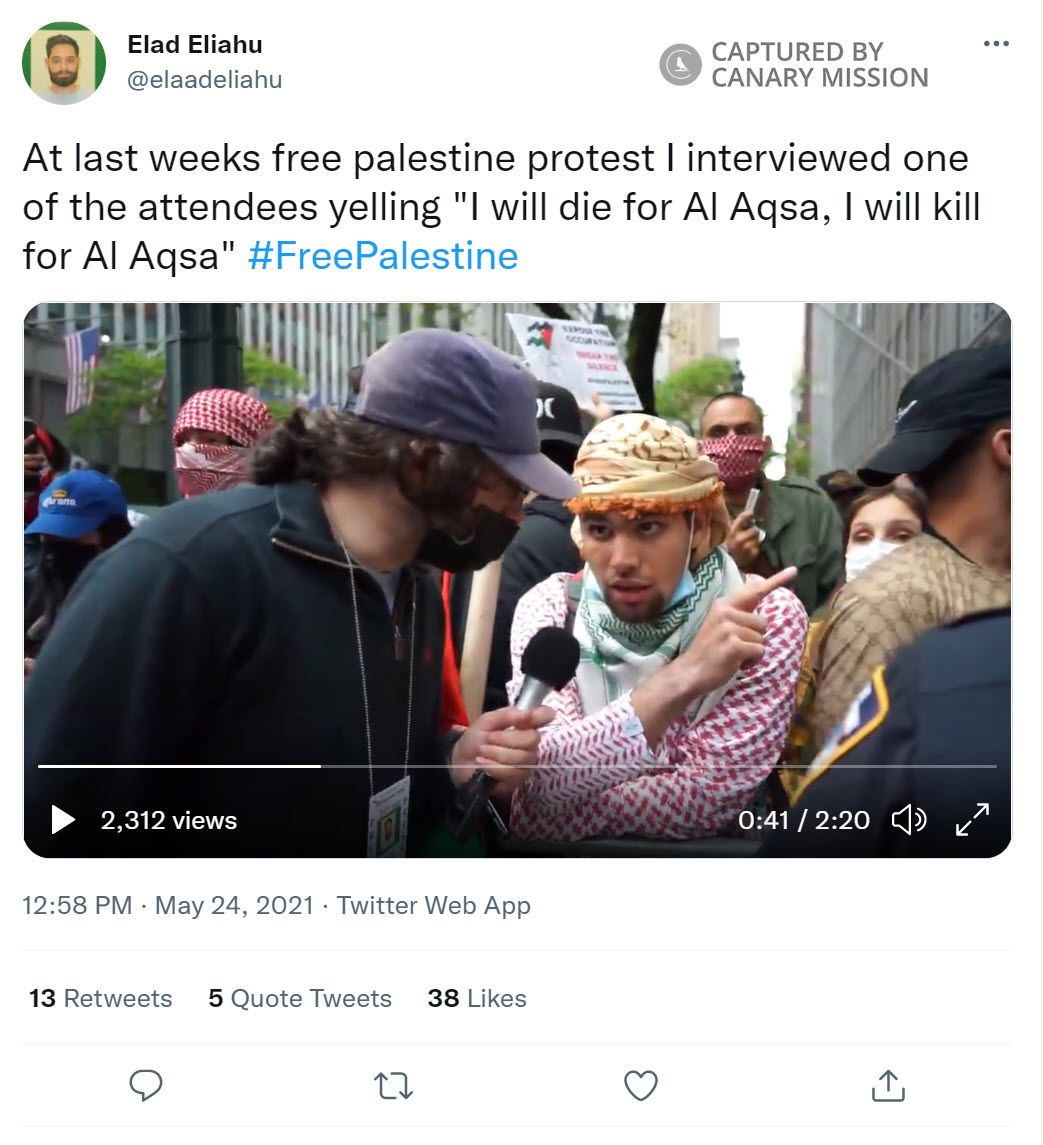 On May 30, 2021, Shuaib said [00:11:52] during an episode of his podcast: “I will defend Al-Aqsa to the death! Because when these people come to Al-Aqsa they shoot people! They attack it! And if one brick of Al-Aqsa is disconnected, it’s worth doing World War Three for Al-Aqsa!”