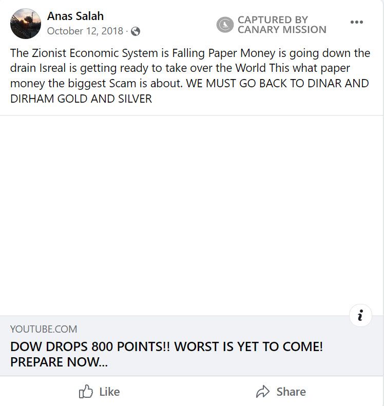 On October 12, 2018, Shuaib wrote on Facebook: “The Zionist Economic System is Falling Paper Money is going down the drain Isreal is getting ready to take over the World This what paper money the biggest Scam is about. WE MUST GO BACK TO DINAR AND DIRHAM GOLD AND SILVER [sic]”