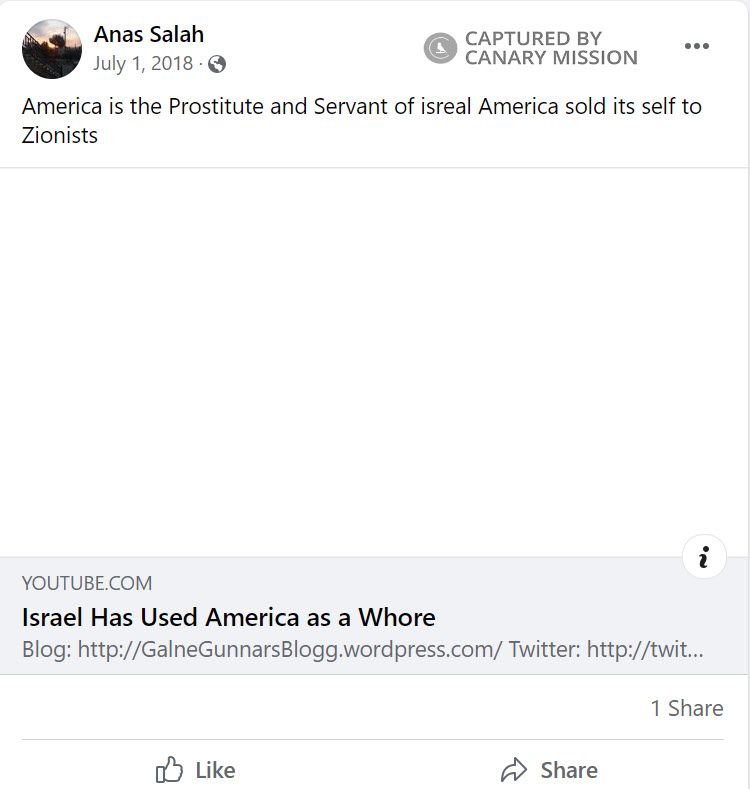 On July 1, 2018, Shuaib wrote on Facebook: “America is the Prostitute and Servant of isreal America sold its self to Zionists [sic]”