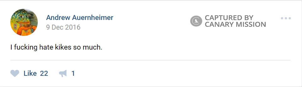 On December 9, 2016, Auernheimer wrote on vk.com: “I f**king hate kikes so much.”