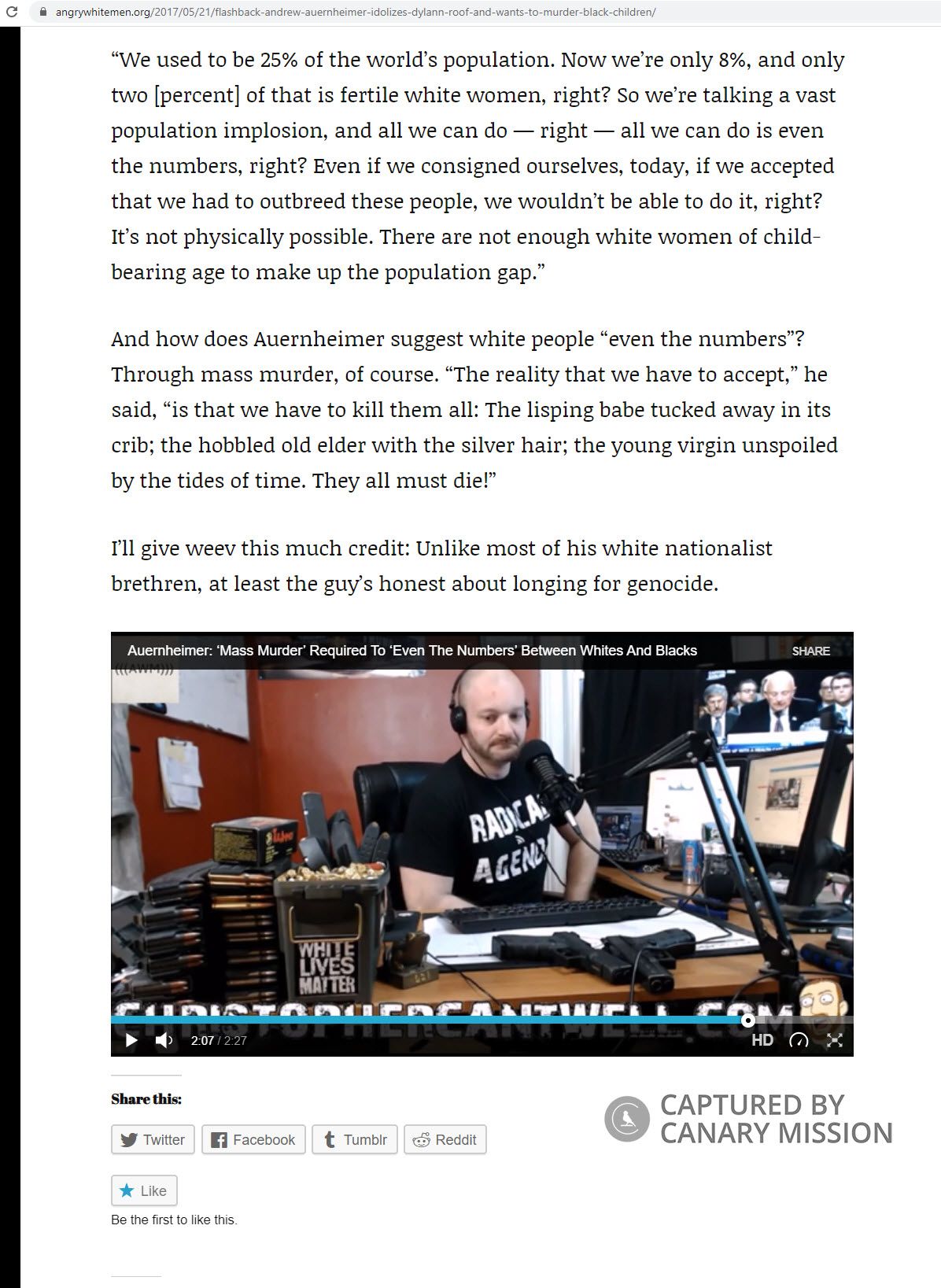 Auernheimer continued [00:01:59]: “There are not enough white women of child bearing age to make up the population gap. The only way we can do it, is mass murder.”